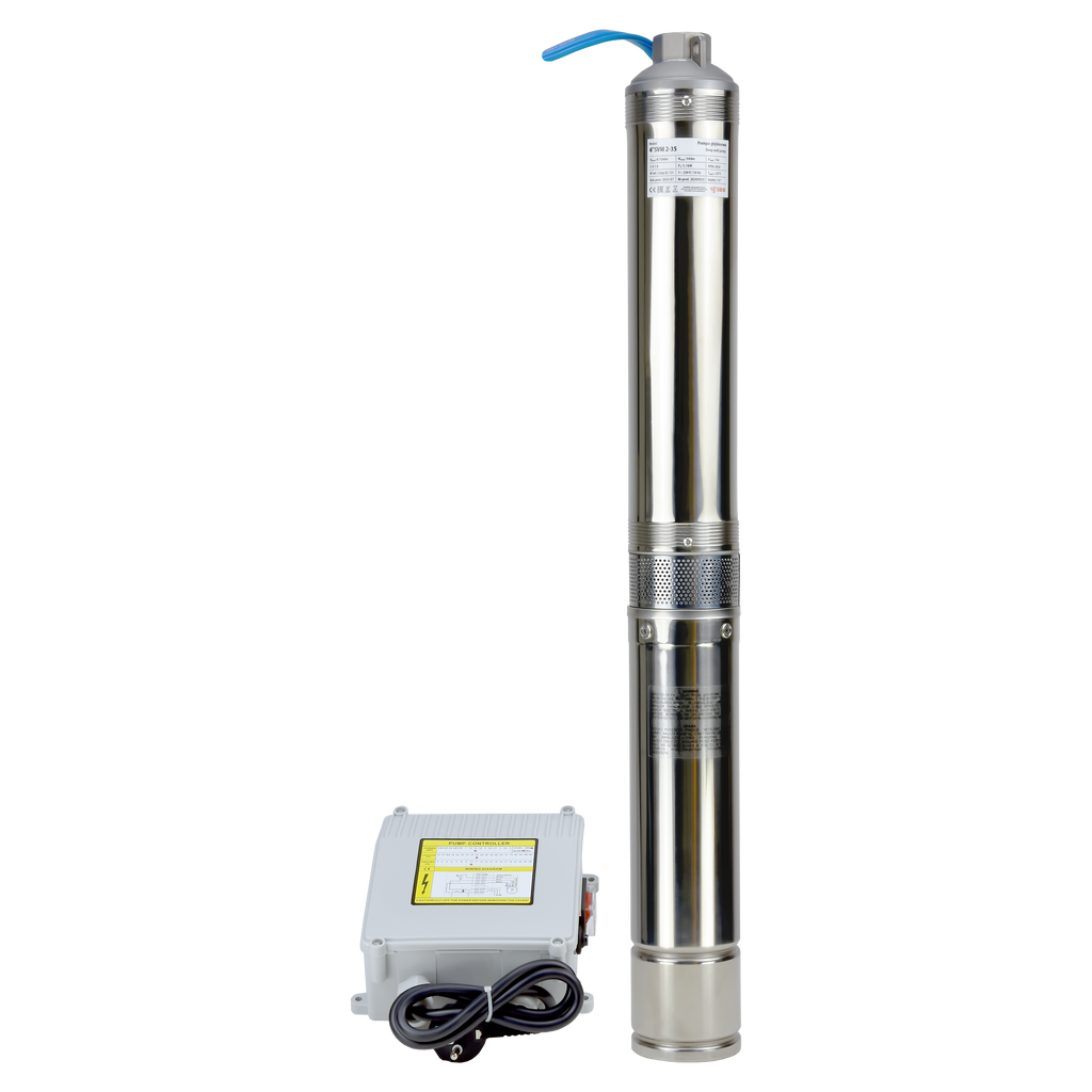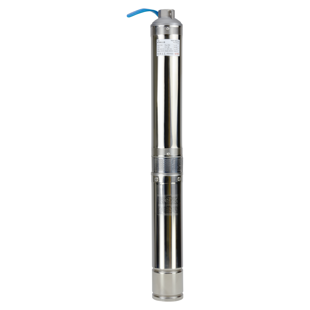 4" SVM to wielostopniowa pompa głębinowa o średnicy 104 mm, przystosowana do instalacji w studniach o minimalnej średnicy wewnętrznej 115 mm, wyposażona w silnik chłodzony olejem z zabezpieczeniem termicznym w uzwojeniu, puszkę rozruchową z wbudowanym zabezpieczeniem nadprądowym i kondensatorem oraz przewód zasilający o długości 30 m, co umożliwia montaż na znacznej głębokości.