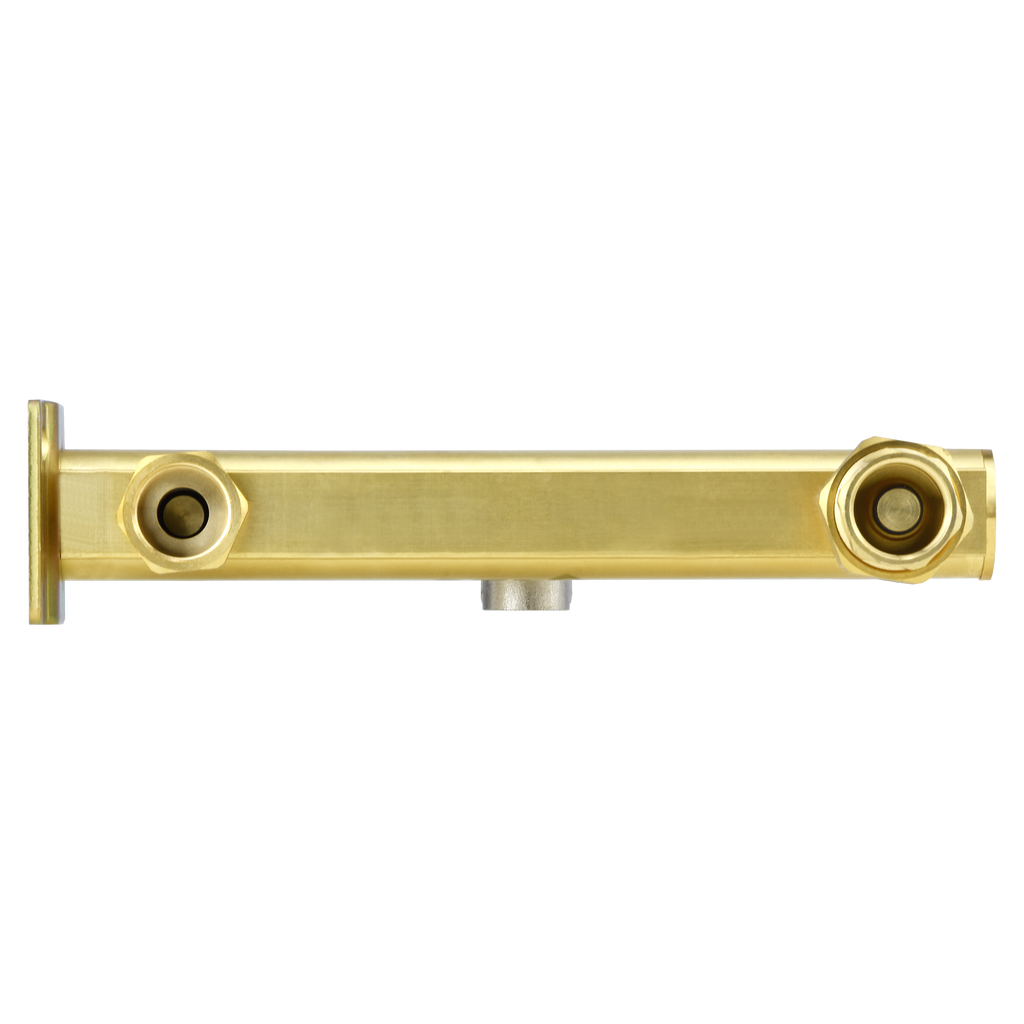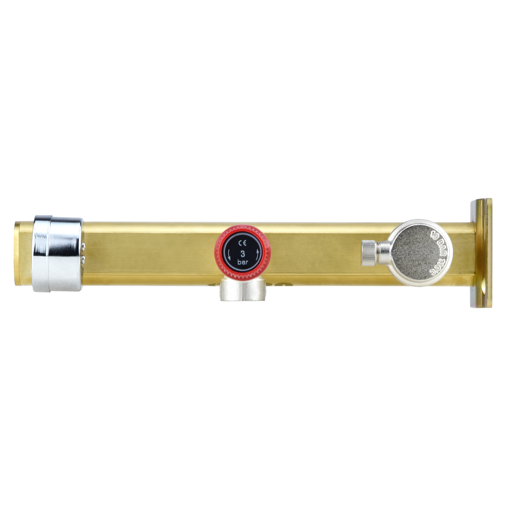 Korpus grupy bezpieczeństwa wykonany jest z mosiądzu CW614N, natomiast listwa montażowa ze stali ocynkowanej, mocowanej do ściany za pomocą kołków i śrub, co zapewnia stabilne podparcie dla naczynia przeponowego o średnicy do 320 mm i obciążeniu do 45 kg. Na korpusie znajdują się przyłącza gwintowane wewnętrzne do podłączenia instalacji oraz naczynia przeponowego, manometr (zakres 0–4 bar lub 0–10 bar), zawór bezpieczeństwa 1/2" o nastawie 3 bar lub 6 bar, a także odpowietrznik automatyczny z zaworem stopowym.